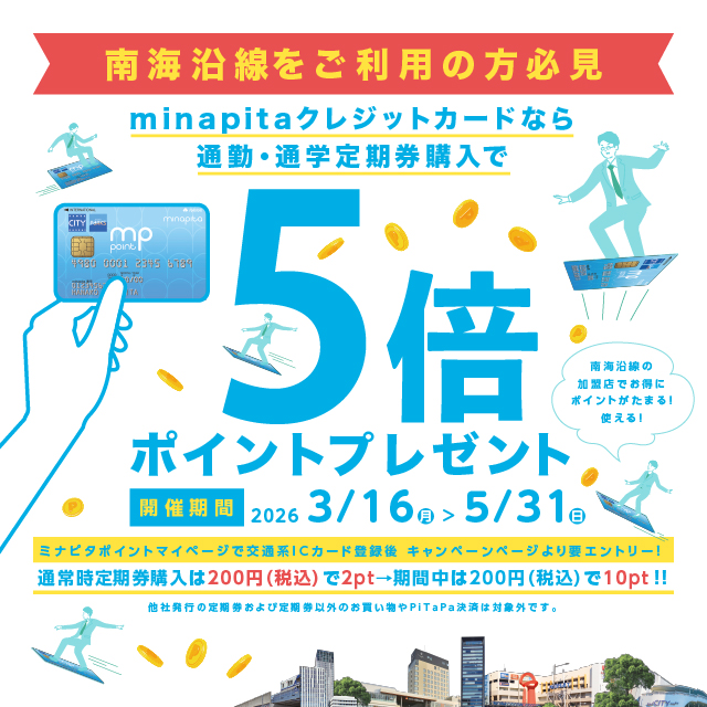 - (1)minapitaクレジットカードで期間中に南海電鉄発行の定期券(通勤・通学問わず)をminapitaクレジットカード決済で購入された方